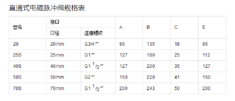 電磁脈沖閥參數(shù)表