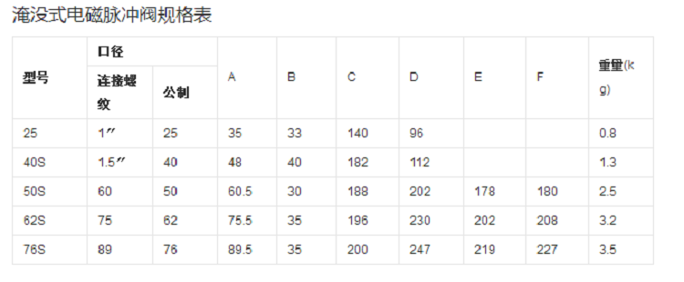 電磁脈沖閥的規(guī)格型號不同,它的具體參數(shù)也不一樣,下面是常用的型號參數(shù)表: